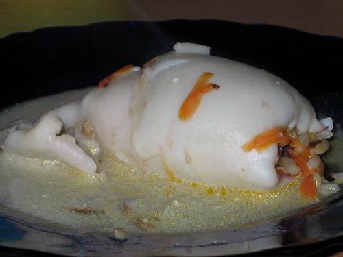 Всё перемешать, начинить кальмары, уложить в посуду.
