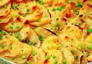 4. Разогреть духовку до 200ºС. Картофель выложить в форму так, чтобы каждый кружок немного заходил на другой Залить картофель сырной смесью. Сверху посыпать оставшимся сыром и уложить кусочки сливочного масла. Поставить форму в духовку, запекать 45 мин.