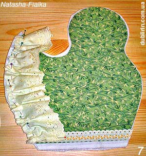 Следим, чтобы тесьма или полоска ткани были пришиты на одном уровне у каждой половинки.