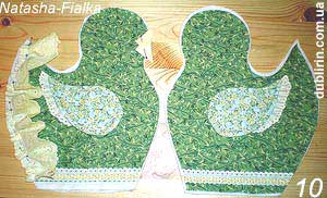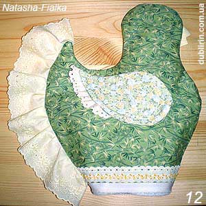 Когда я шью подобных курочек из «хохломских» и «гжельских» тканей, то отрезаю от их купонов подходящий кусочек-бордюр и пришиваю понизу как декоративный элемент.