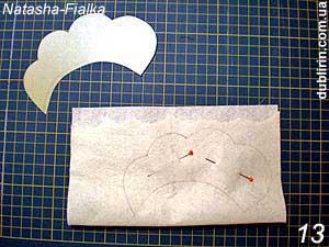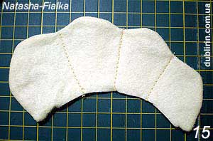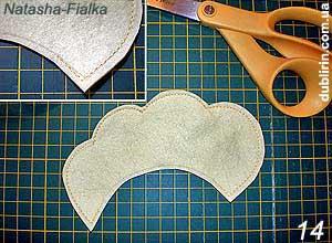14. Прострачиваем по нарисованным контурам, оставляя нижнюю дугу незастроченной. Здесь есть маленький нюанс: я заметила, что потом удобнее пришивать (да и результат аккуратнее), если в начале и в конце от этой нижней дуги гребешка захватим по 0,5 см (см. фото).