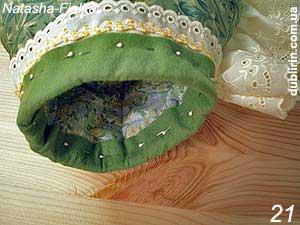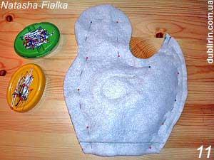 21. Выкраиваем из мягкого фетра полоску шириной 4.5см см. А длину нужно взять по длине получившейся окружности (это может быть 34-38 см). Можно вырезать и две полоски по 17-19 см и пришить их отдельно на каждую половинку курочки, а не по круговой. Прикалываем по кругу с внешней и внутренней сторон фетровую окантовку (постепенно вытаскиваем предыдущие фиксирующие булавки) и пришиваем её вручную незаметным швом поочерёдно:сначала по внешнему краю, потом по внутреннему.