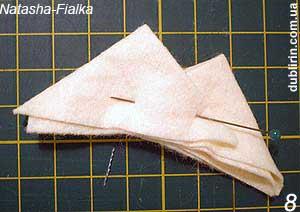8. Для клюва вырежем из ткани два квадратика 6х6 см и каждый дважды сложим по диагонали в маленькие треугольнички. Можно прогладить. Посадим детальки друг в друга, чтобы получилась имитация клювика.