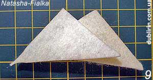 9. Из фетра ещё проще – достаточно одного квадратика 6х6 см, который по диагонали разрежем на два треугольника и каждый только один раз сложим пополам по диагонали. Потом аналогично вложим эти треугольнички друг в друга.