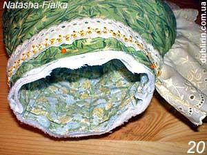20. Возвращаемся к курочке. Набиваем до желаемой пухлости голову, хвост, грудку, немного спинку. Вставляем чехол, примеряем, как он сидит, и при необходимости убираем или добавляем набивку. Когда желаемая форма достигнута, подрезаем-подравниваем нижний край курочки и чехла, скалываем, чтобы края не смещались.