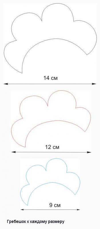 Итак, гребешок. Он тоже может быть как тканевым, так и фетровым. Шьём одинаково: складываем кусочек ткани (фетра) пополам лицевой стороной вовнутрь, обрисовываем выкройку, следя, чтобы вокруг остался запас для припусков не меньше 0,5 см.