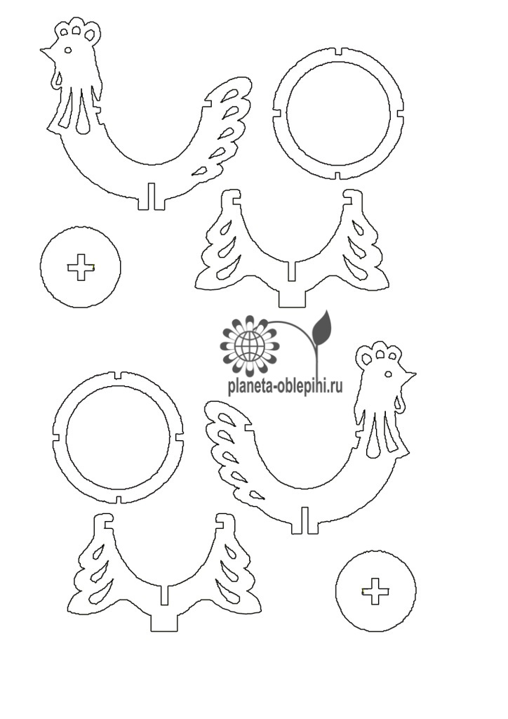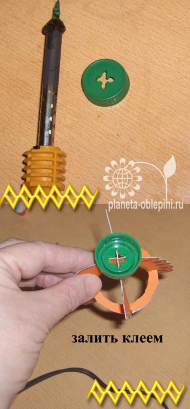 Подставку для петушка лучше сделать из крышки. Прорези можно сделать нагретым гвоздем или паяльником. Вставить подставку и залить внутри клеем.