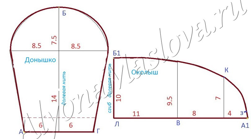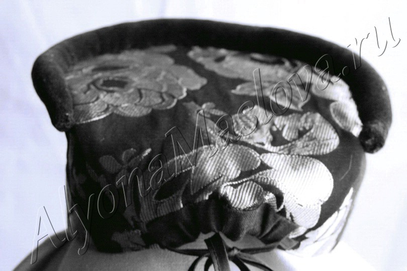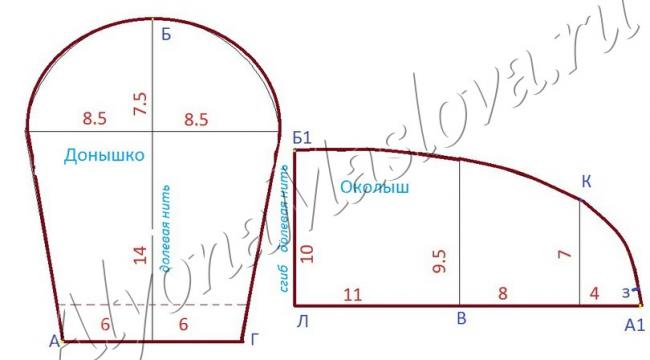За основу взят этнографический образец собирательницы Репиной Татьяны Михайловны. Выкройка дана на размер головы с обхватом в 54 см. Делая её для себя, уменьшайте или увеличивайте околыш-очелье между точек Л и В. Расстояние отрезка ЛА1 равно обхвату головы минус 4 см. Длинна отрезка Б1 А1 равно отрезку донца АБ.