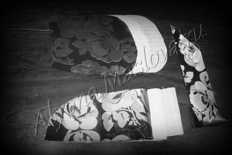 Прежде чем собрать верхушку, её естественно сажаем на флизелин и делаем кулиску. Кулиска равна длине нижнего отрезка донца АГ и ширине в 5-6 см. Короткие отрезки кулиски подвернуть на 0,5 и ещё раз на 0,5 с каждой стороны и прострочить. Перегнуть вдоль, приложив к краю донца, настрачиваю кулиску, в получившийся желобок.