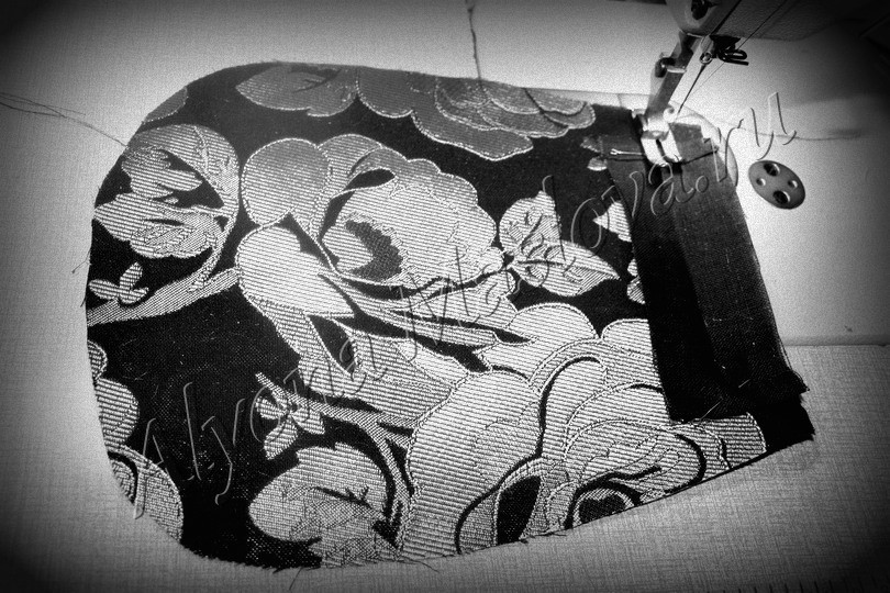 Собрать вместе детали очелья и донца, соблюдая монтажные надсечки, дать строчку на расстоянии 1 см от среза. Полезной вещью типа — ножницы-зигзаг срезать запас близко к краю, но будьте осторожны не режьте слишком близко. Можно обойтись и без ножниц, просто нарезать припуск сегментами через каждые 1 см, на закруглениях через 5 мм.