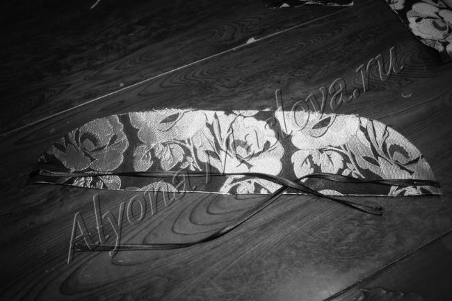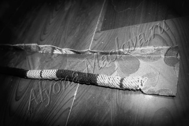 В «зев» кулиски продеть завязки навстречу друг другу. Это первый вариант шамшура с валиком не подходящего цвета.