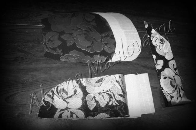 Из натуральной жаккардовой ткани раскроить детали очелья и донышка-донца учитывая направление долевой нити и припуски на швы в 1 см. Донце кроят из самой красивой ткани и оно может состоять из двух деталей, очелье можно кроить из ткани попроще, но в тон ткани донышка всё же. Из другой ткани, здесь использован хлопковый бархат, раскроить по косой деталь канта, длиной равной расстоянию А1 К плюс 4 см и шириной 8-10 см. Кант был раскроин сначала из той же, жаккардовой ткани, но получив консультацию от специалиста Ирины Стрельцовой, выяснилось что это ошибка и валик надо кроить из другой ткани. Не забудьте сделать монтажные надсечки середины донца и очелья, очень поможет при дальнейшей сборке, поверьте.