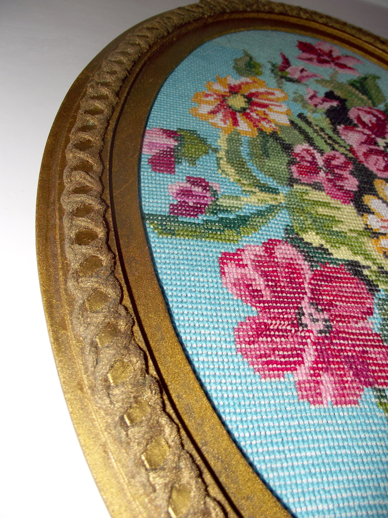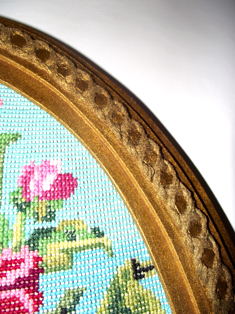 Картина была вышита давно, но долго лежала на полочке в ожидании рамки. Пробовали заказать в багетной матерской. Но там берутся за овальные рамки, если разница в диаметрах не более 7 см. Непроходим...