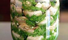 Начну с совета: грибы лучше покупать мелкие, т.к. они будут аппетитнее смотреться в блюде! Крупные грибы рекомендуется разрезать на 2-3 части по вертикали, чтобы на срезе была форма грибка. Первый способ: в банку укладываем всякую зелень: пучок укропа, листья смородины, вишни, мелко нарезанные чеснок и корень хрена, 10-15 горошин чёрного перца, грибы. Заливаем рассолом, закрываем капроновой крышкой и, если температура воздуха высокая, ставим в холодильник на 2-3 суток.